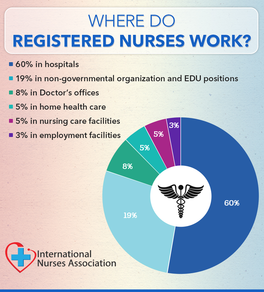 Registered nurses are needed far and wide, and there dispersal amongst various facilities is illuminating. Commonly, you associate nurses with hospitals, but their expertise is needed in a plethora of environments. An overwhelming amount of nurses, (60% to be exact) operate in hospitals. Comparing this percentage to the mere 5% working in nursing homes, RN’s have disseminated into non-governmental and EDU positions, as well as employment facilities and doctor’s offices.